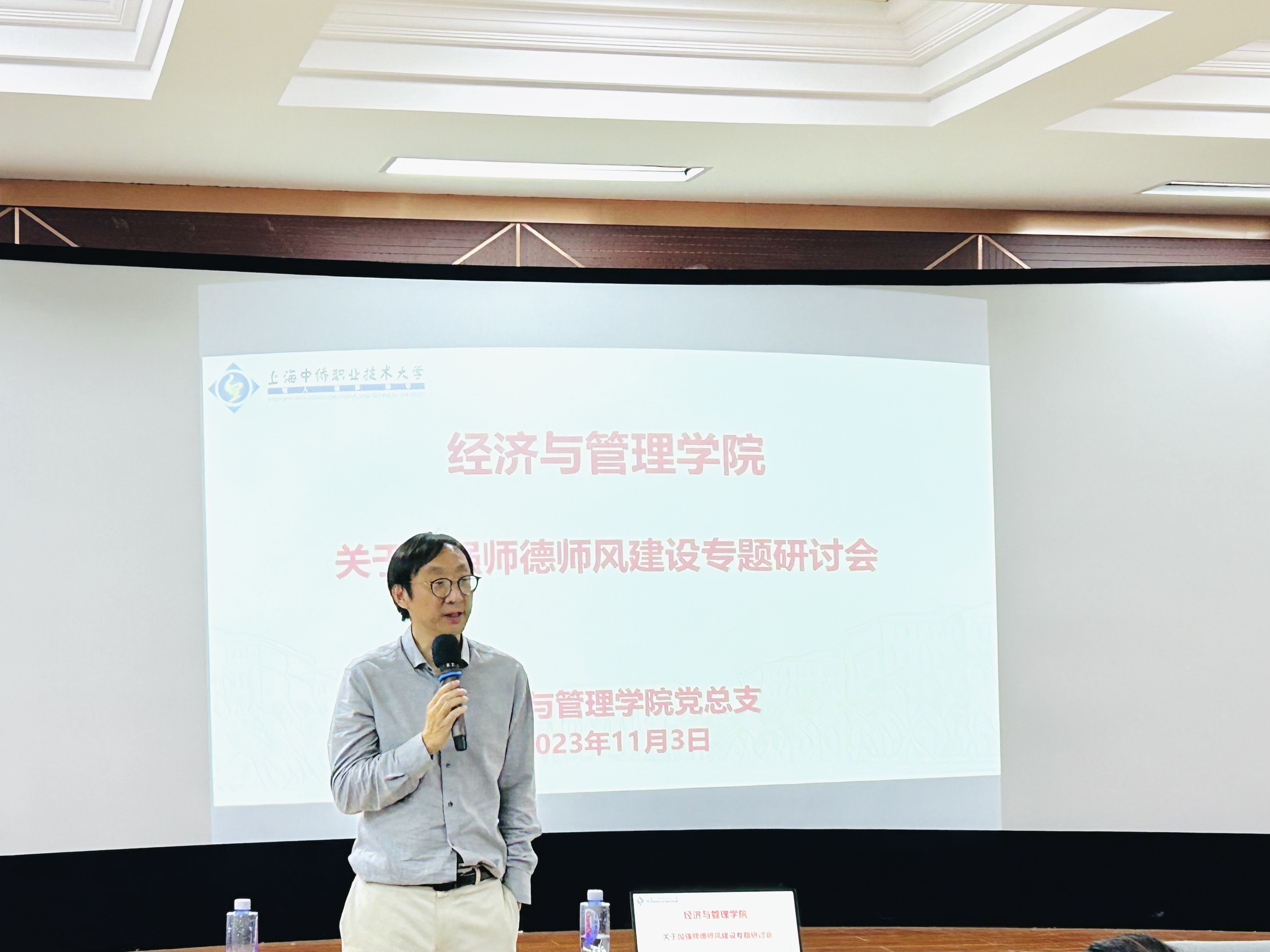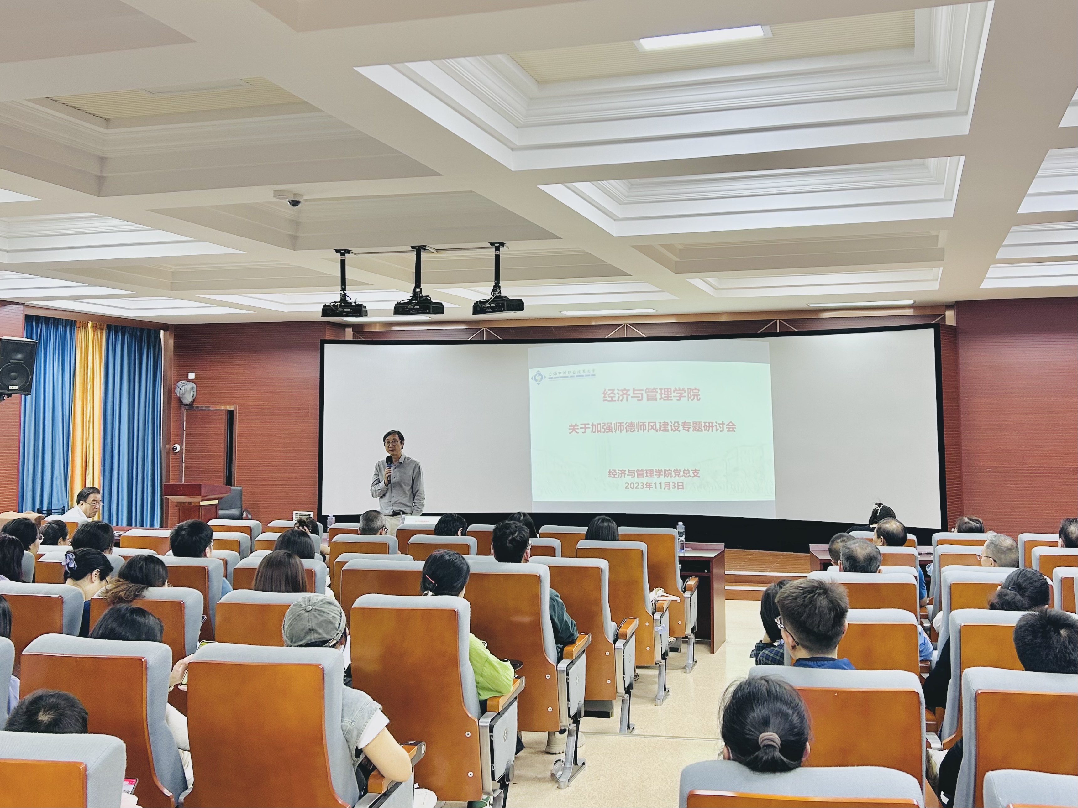 2023年11月3日周五13点,经管学院张院长、院党总支书记杨慧、副院长王殿安、副院长范海燕、院党总支副书记郭骏、各专业主任在6号楼306会议室召开全体教职员工大会,加强师德师风建设专题研讨会。会议由张院长主持。