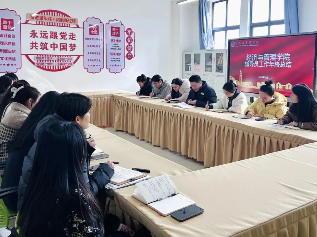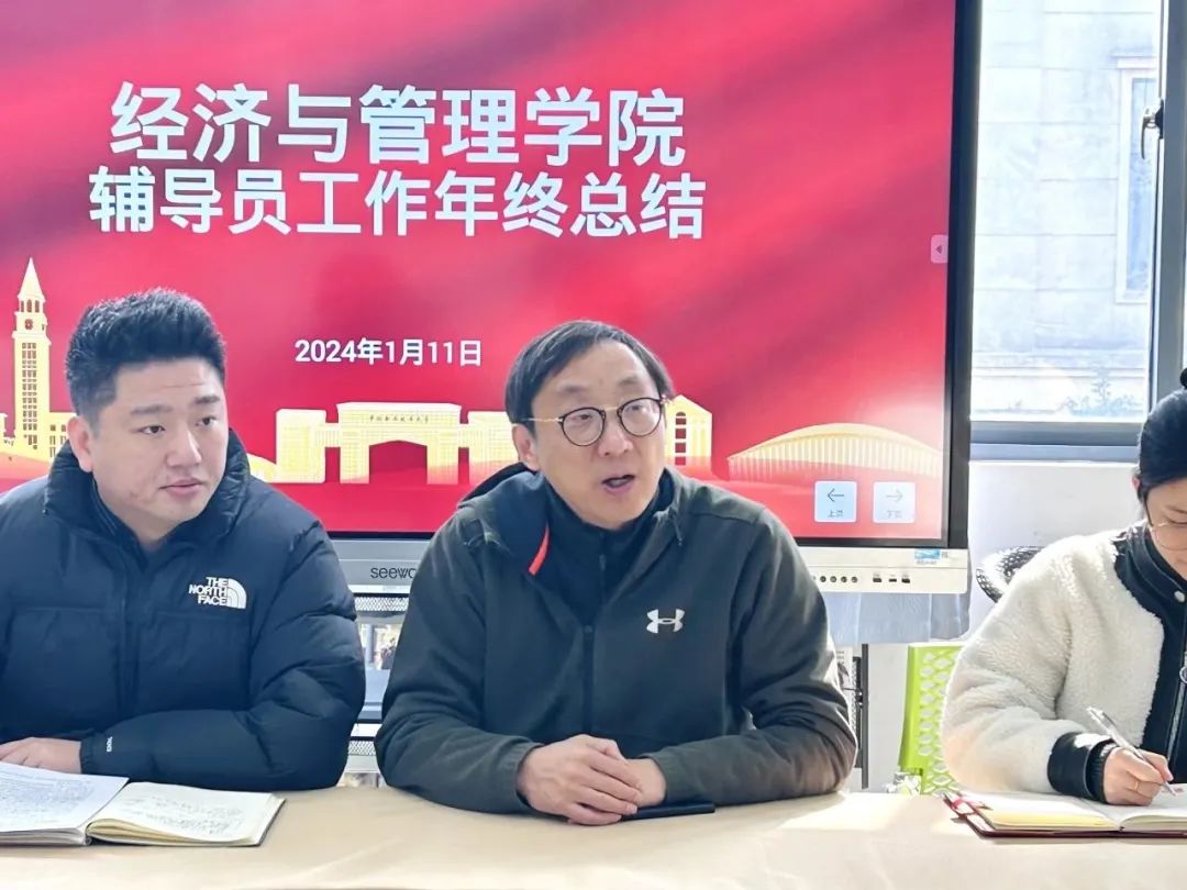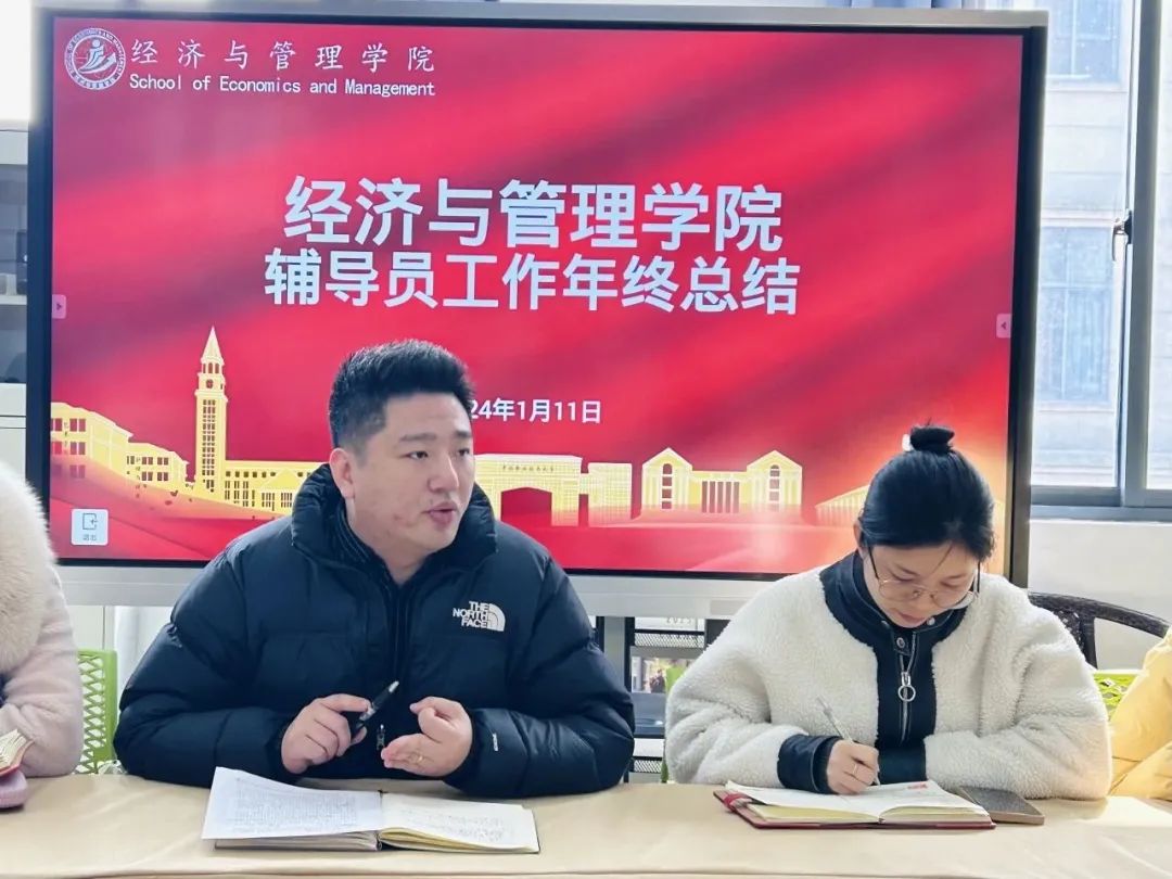 2024年01月11日中午,经济与管理学院学工年终总结会议在教学楼4号楼201室召开,本次会议旨在回顾过去一年的工作成果,总结经验教训,并部署期末学生工作。本次出席会议有经济与管理学院院长张炳达教授、党总支书记杨慧老师和党总支副书记郭骏老师,所有辅导员参会,会议由郭骏老师主持。