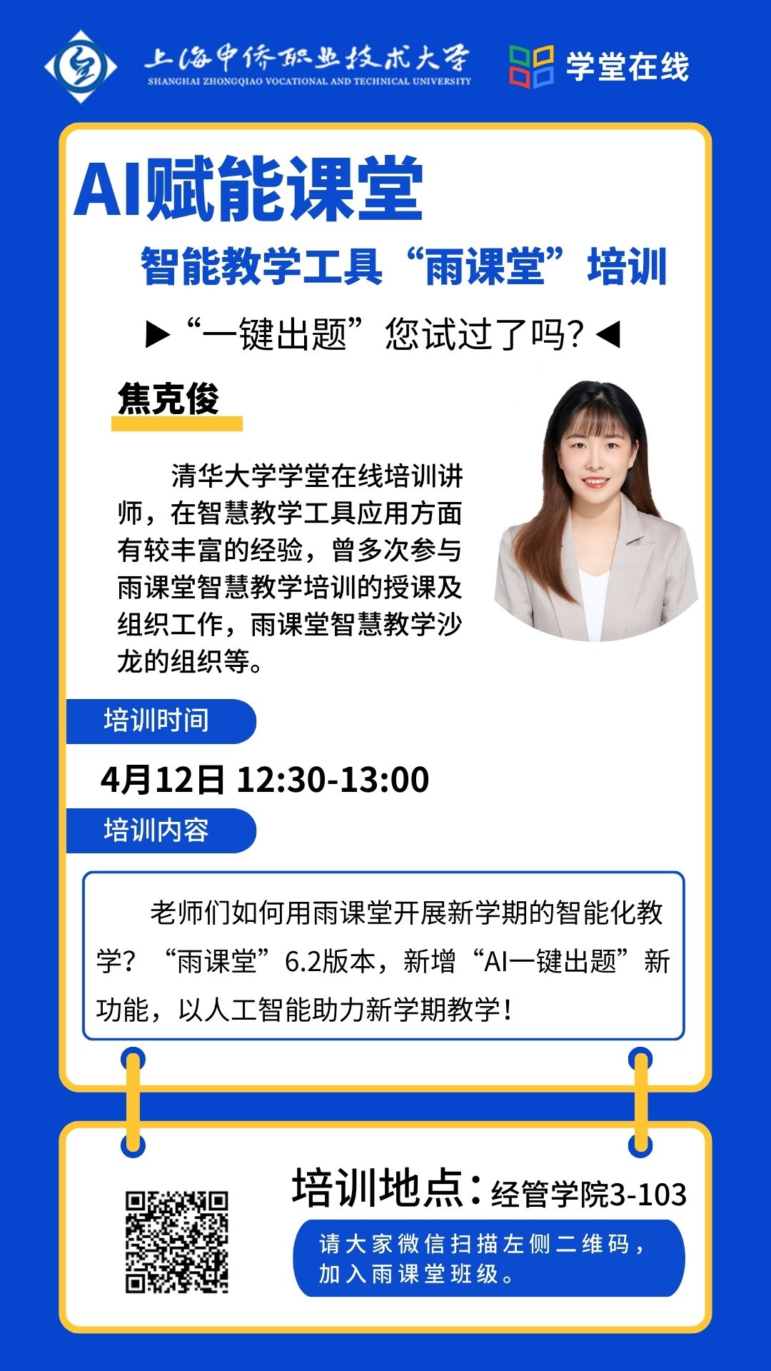 会议最后,两位培训讲师现场解答了老师们的疑问,通过培训有效提升我院智慧教学工具的应用,让AI赋能走进课堂,共同助力建设“人人皆学、处处能学、时时可学”的学习型社会。(供稿:肖韵琪)