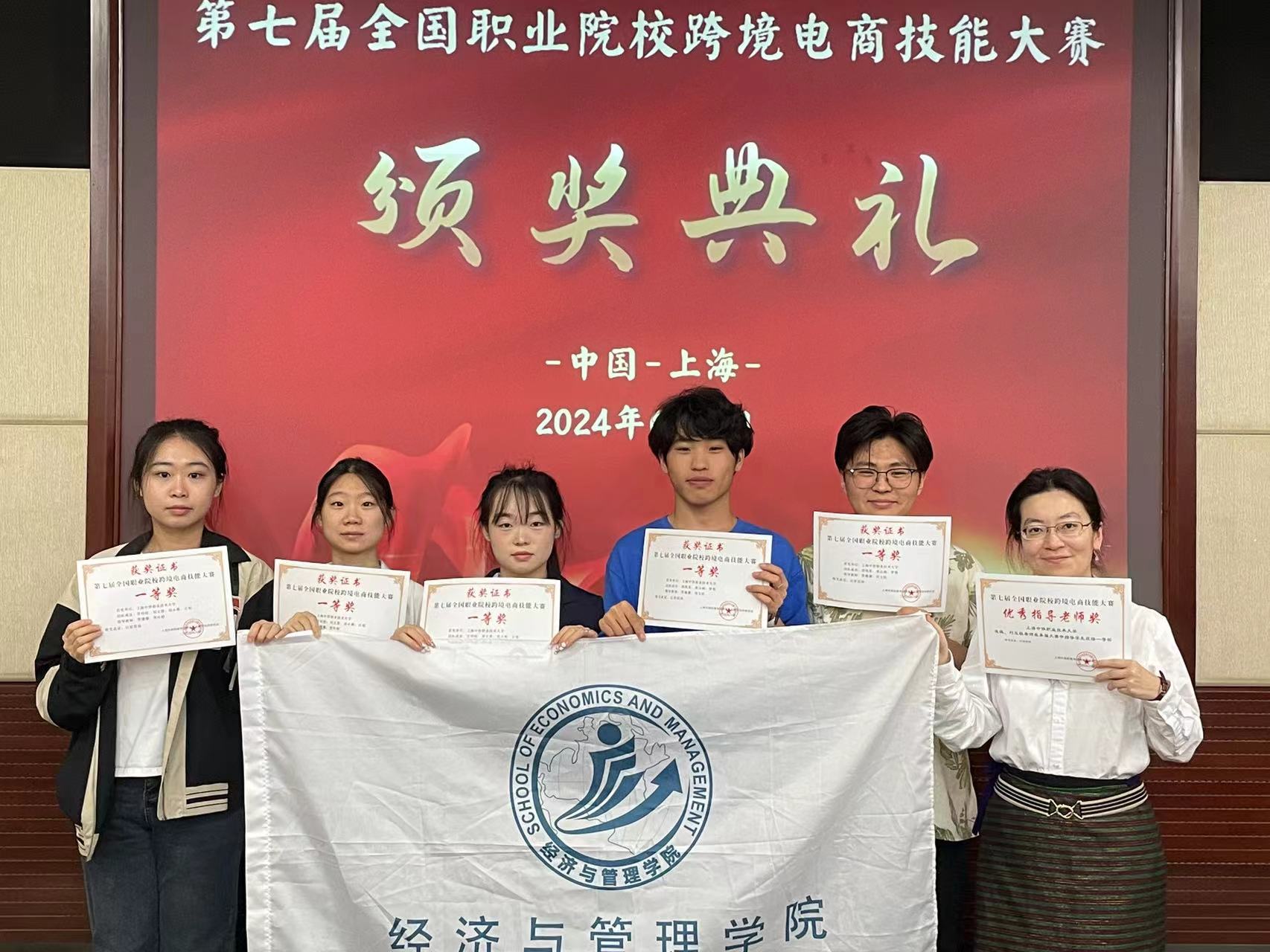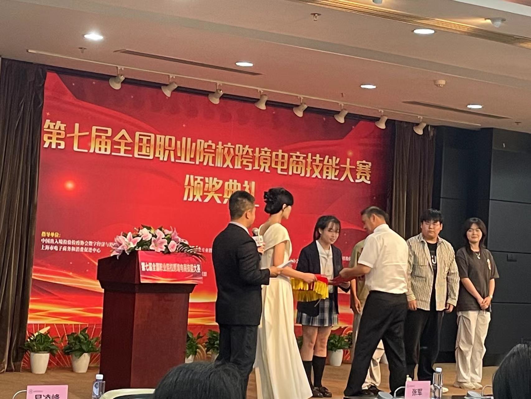 6月7日下午,在刚刚结束的第七届全国职业院校跨境电商技能大赛中,上海中侨职业技术大学经济与管理学院国际商务专业获奖的指导教师和参赛学生团队代表,参加了于上海亚龙国际广场举行的大赛颁奖典礼。