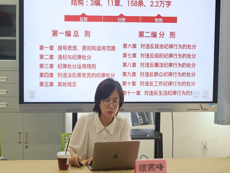 为深入贯彻落实学校党委关于开展党纪学习教育的部署要求,稳步推进2024年民创计划子项目《民办高职院校廉洁文化建设的路径分析》研究,10月12日下午,经管学院党总支精心组织,邀请上海第二工业大学马克思主义学院中国近现代史纲要教研室主任、形势与政策教研室主任,硕士生导师,校理论讲师团成员、浦东新区党史学习教育宣讲团成员,顾燕峰副教授作《中国共产党纪律处分条例》(以下简称《条例》)专题讲座。此次专题讲座旨在深化对《条例》的理解与应用,提升党员教师的纪律意识。讲座由经管学院党总支书记杨慧主持,学院部分党员教师和辅导员参加了此次学习。