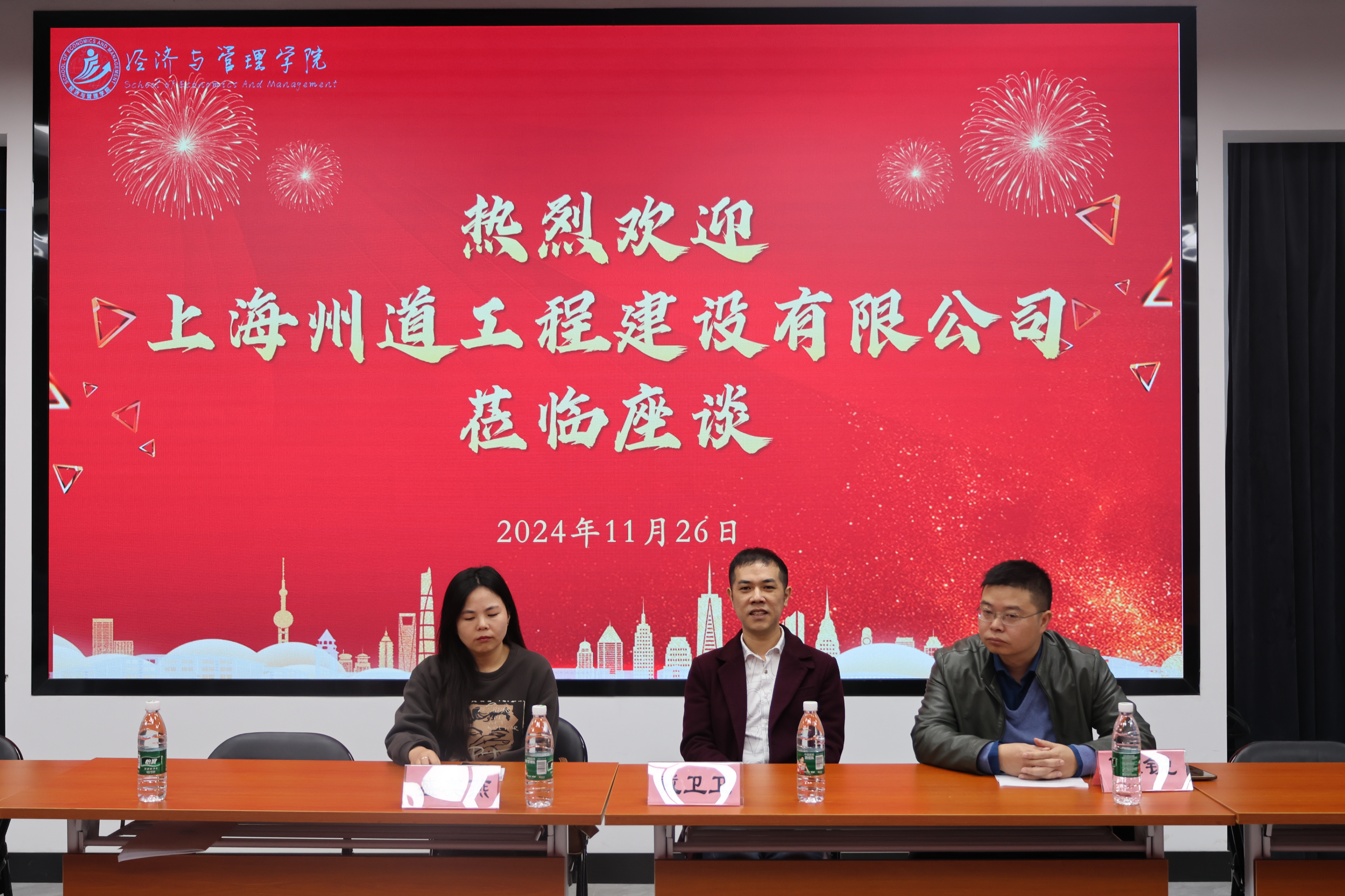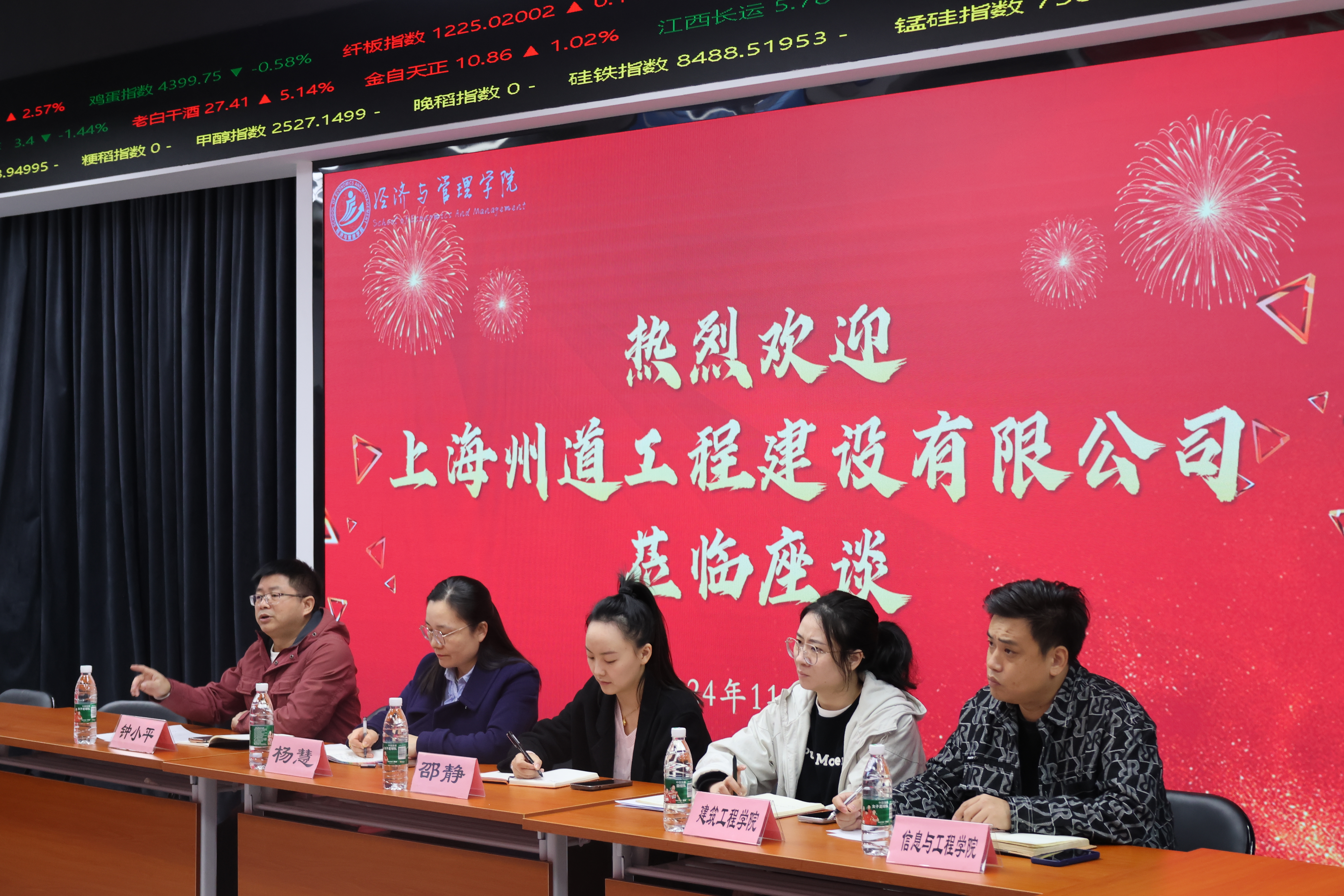 为全面贯彻落实党的二十大、二十届三中全会精神,实现职业本科院校毕业生高质量就业,经济与管理学院积极探索“产教融合、合作育人、合作就业、合作发展”人才培养模式。2024年11月26日上午,经管学院在3号楼103新商科综合实训中心召开引企入校、访企拓岗座谈会,上海州道工程建设有限公司(金山区)(以下简称州道公司)总经理戴卫卫、办公室主任盛美燕应邀莅临经管学院开展座谈交流。学院党总支书记杨慧副教授、学生支部书记邵静,信息工程学院党总支副书记唐斌,建筑工程学院直属党支部副书记岳建梅、金融服务与管理专业主任钟小平以及专业教师陈锐,出席此次校企合作座谈会。会议由钟小平老师主持。