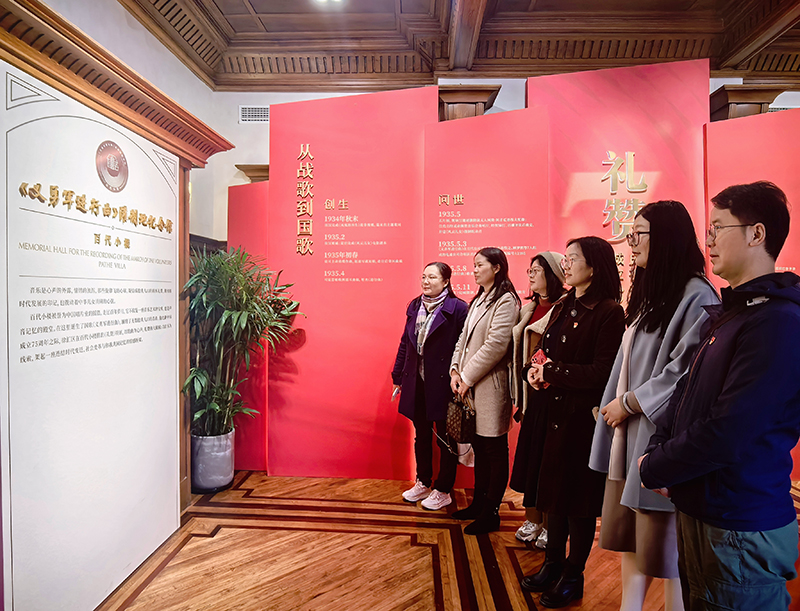 活动伊始,教师党员们前往《义勇军进行曲》灌制地纪念馆(百代小楼)参观学习。在纪念馆讲解员的悉心引导下,大家沉浸式感受浓厚的历史韵味,深入了解“从战歌到国歌”的辉煌历程,深切体会聂耳、冼星海等音乐先驱的崇高精神和高尚品格。此外,恰逢中华人民共和国成立75周年,百代小楼特别推出《礼赞——庆祝中华人民共和国成立75周年特展》。通过内容丰富、史料详实的展览以及先进的播放设备,教师党员们得以近距离感受新中国成立75年来激荡人心的时代乐章,这一体验极大地激发出大家的爱国情怀与奋斗精神,进一步坚定了在新时代新征途上勇于担当使命、不懈砥砺前行的决心。