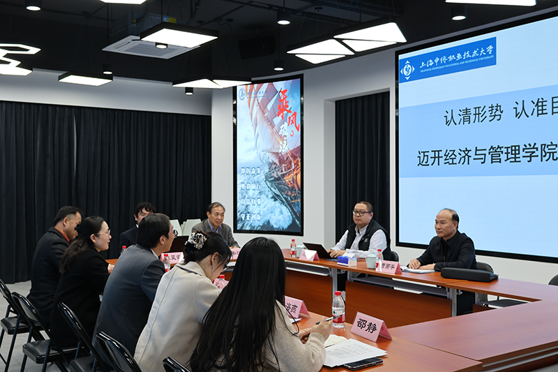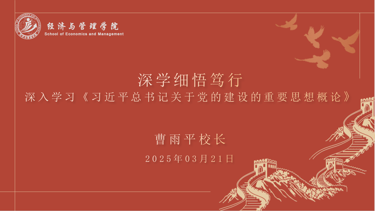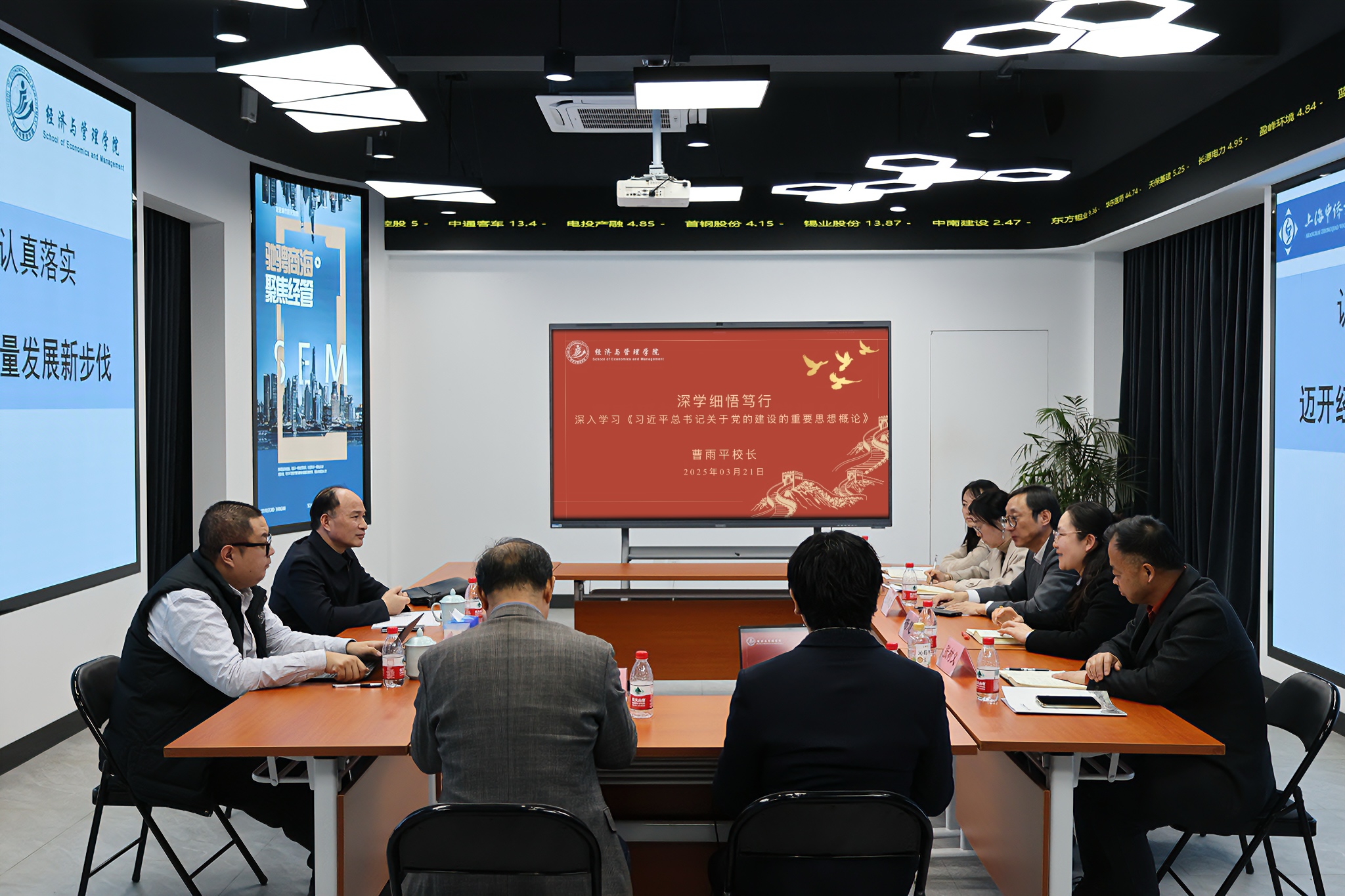 2025年3月21日,曹雨平校长莅临经济与管理学院主讲“深学细悟笃行——深入学习《习近平总书记关于党的建设的重要思想概论》”专题党课、并到经管学院开展调研。经济与管理学院院长张炳达、党总支书记杨慧、副院长张树义、副院长范海燕、综合办公室主任韩波、院长助理耿昊裔等参会。