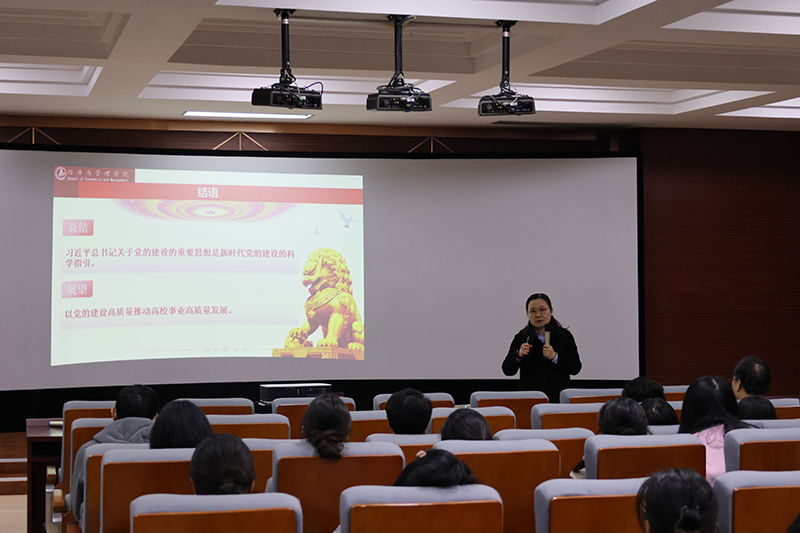 为深入学习贯彻习近平新时代中国特色社会主义思想,进一步加强党员党性修养和理论学习,经济与管理学院党总支于2025年3月21日在6号楼306会议室组织开展“书记上党课”暨《习近平总书记关于党的建设的重要思想概论》专题学习会,学院党总支全体党员参加,会议由党总支书记杨慧主持。