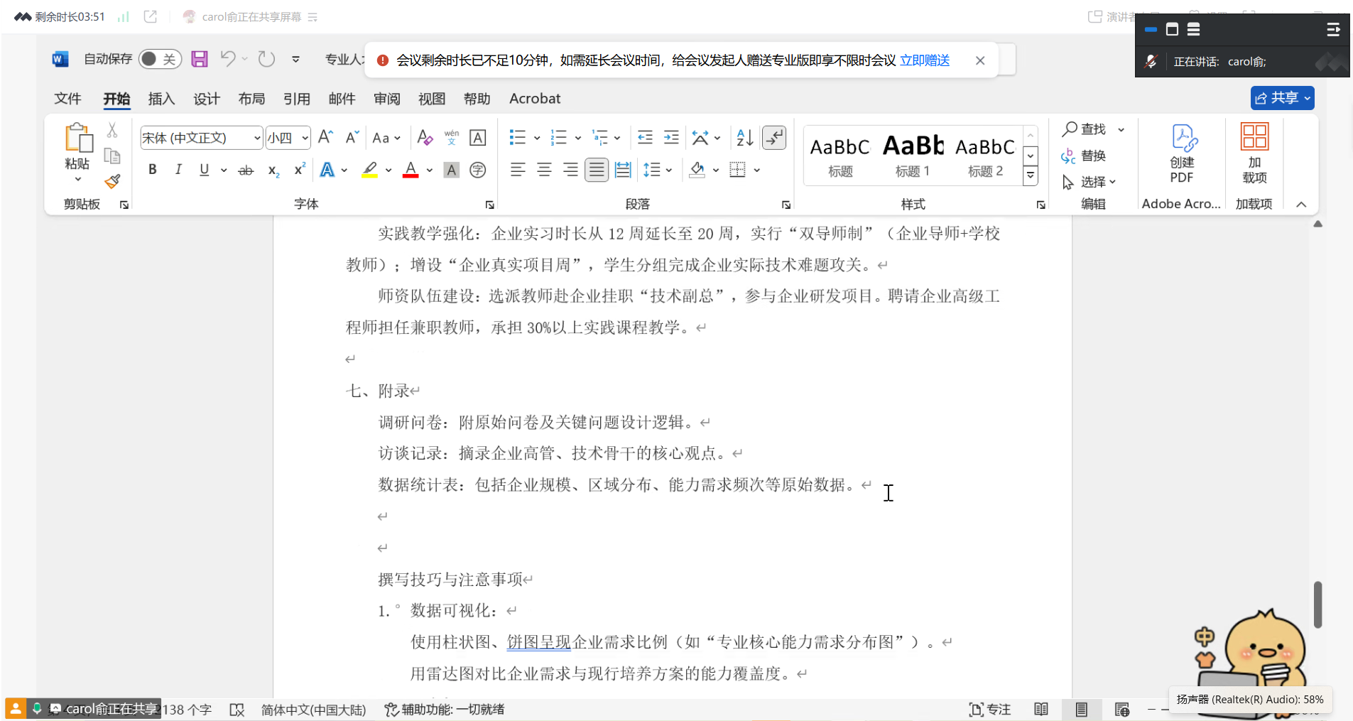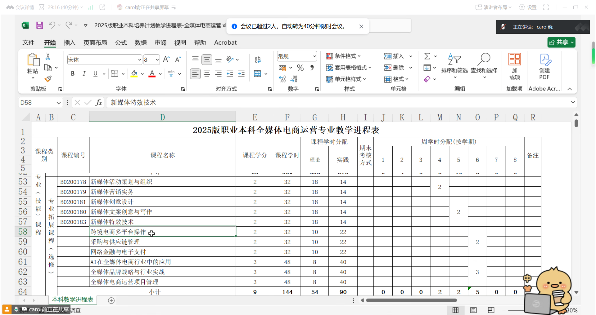 为促进教育链、人才链、产业链、创新链的全方位融合,培养出符合企业需求的高素质人才,5月25日晚,全媒体电商运营专业借助腾讯会议平台,开展2025年人才培养方案修订研讨会。本次会议由专业主任俞春英副教授主持,经济与管理学院党总支书记杨慧副教授以及全体专业教师共同参会。
