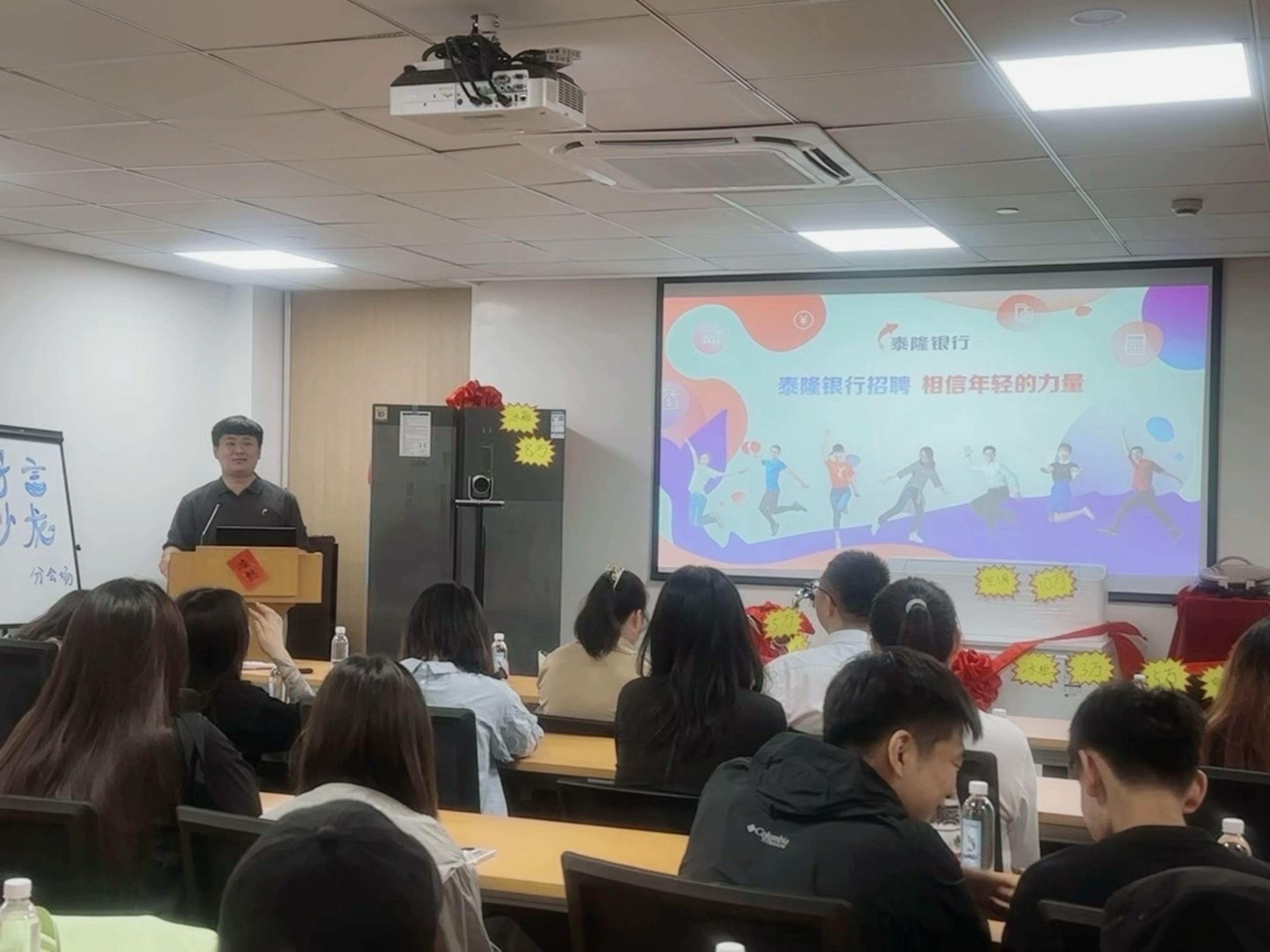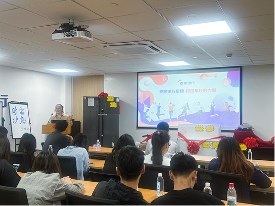 然后,信贷部客户经理、15届证券实务毕业生曹展腾以过来人师兄视角展开分享。他不仅详细介绍了泰隆银行的招聘要求、人才培养模式,还结合自身职场经历,揭秘从校园新人到业务骨干的成长路径。他强调职场中沟通技巧与风控意识的双重修炼,引发在场学子频频点头。