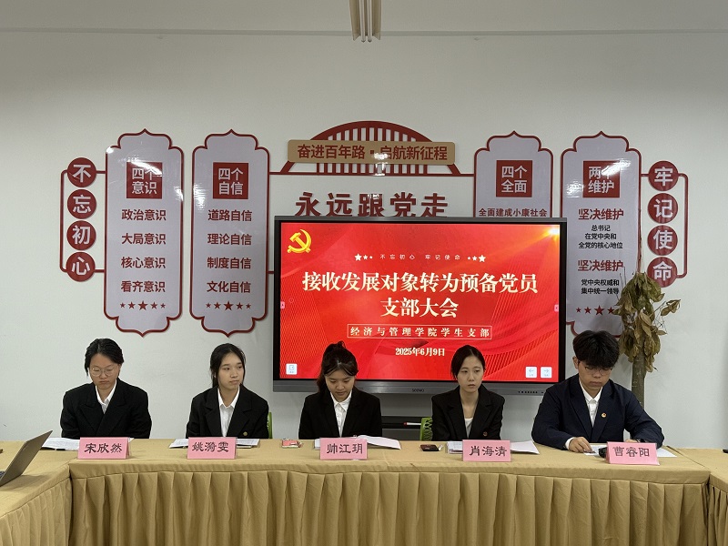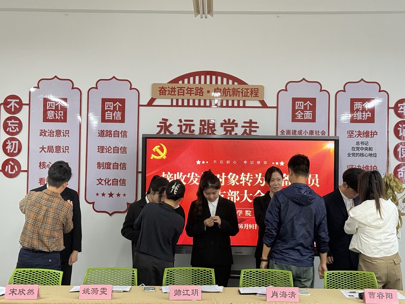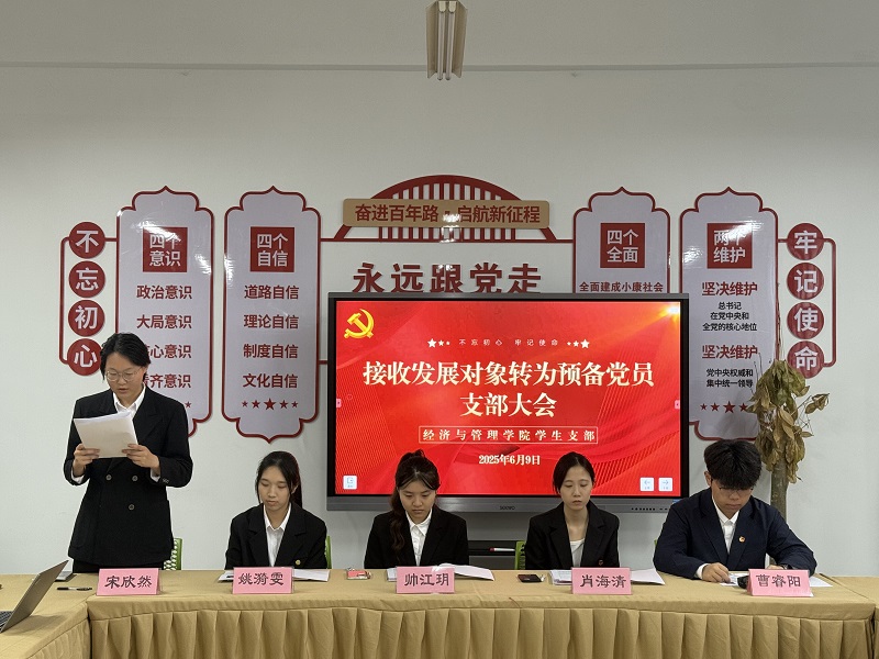 为进一步加强基层党组织建设,2025年6月9日上午10:00,经济与管理学院学生支部在4号楼201召开发展对象转中共预备党员接收会议,本次会议严格按照组织程序,讨论帅江玥、姚漪雯、肖海清、宋欣然和曹睿阳五位同志为预备党员事宜。会议由经济与管理学院学生支部书记邵静同志主持,我支部共有党员44名,其中有表决权的正式党员33名,出席会议有表决权的党员33名,超过本支部有表决权党员半数,符合规定人数。