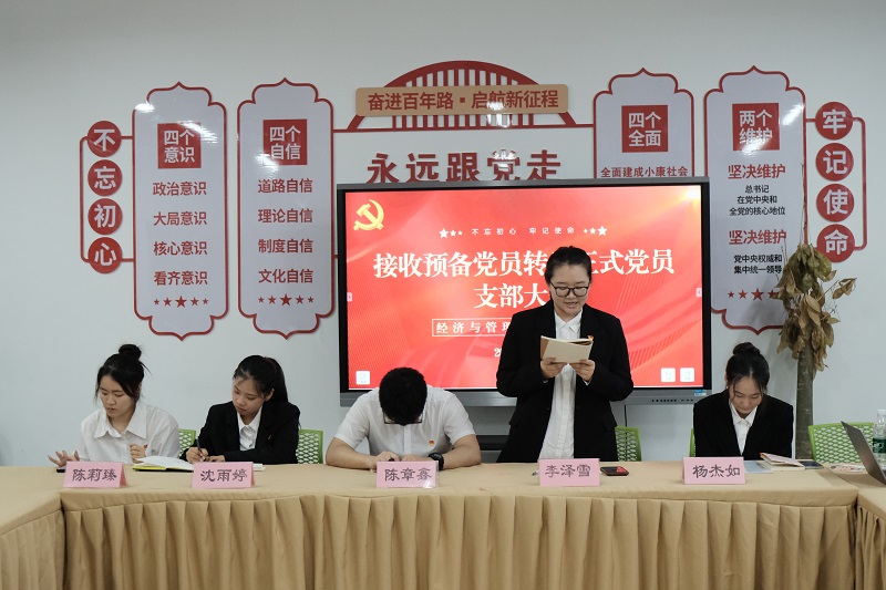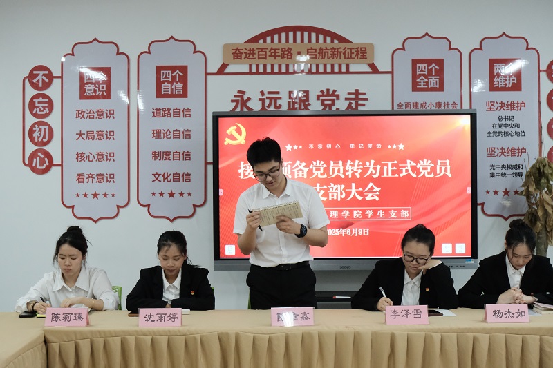 为进一步加强基层党组织建设,2025年6月9日下午13:00,经济与管理学院学生支部在4号楼201召开了预备党员接收大会,本次会议严格按照组织程序,讨论陈章鑫、沈雨婷、杨杰如、李泽雪和陈莉臻五位同志为正式党员事宜。会议由经济与管理学院学生支部书记邵静同志主持,我支部共有党员44名,其中有表决权的正式党员33名,出席会议有表决权的党员33名,超过本支部有表决权党员半数,符合规定人数。