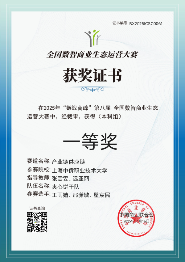 2025年5月25日-6月9日,由中国商业联合会主办的第八届“链战商峰”全国数智商业生态运营大赛全国总决赛在线上举行。来自我校经济与管理学院的6名本科学生组成的两支代表队,分别在“产业数字化”赛道和“产业链供应链”赛道夺得一等奖。
