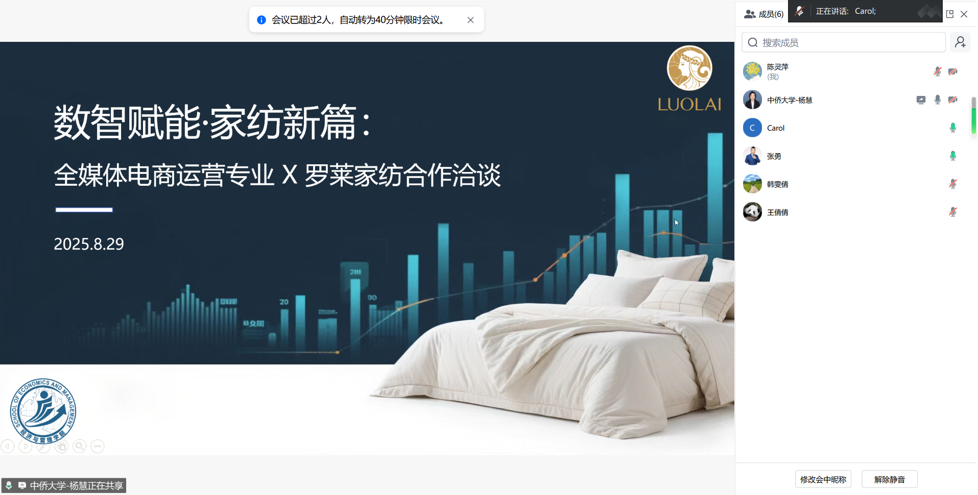 为深化产教融合、拓展协同育人路径,8月29日晚,全媒体电商运营专业与罗莱生活科技股份有限公司(原罗莱家纺)通过线上会议形式开展校企合作洽谈。会议由专业主任俞春英主持,经管学院党总支书记杨慧、专业教师陈灵萍、王倩倩、韩雯倩与罗莱生活线上爆品总经理张勇等企业代表共同参会,共谋数字化时代家纺产业与电商教育融合发展新路径。