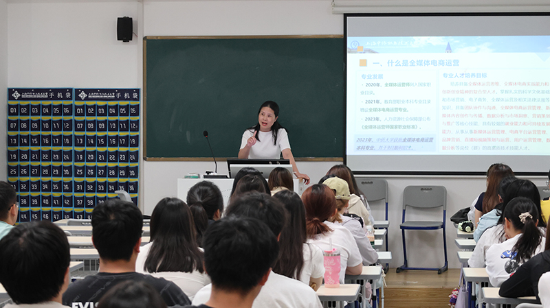 随后,专业主任俞春英以“探索全媒体电商运营魅力 开启未来商业新征程”为主题,从什么是全媒体电商运营、专业前景与就业方向、课程体系与实践教学、办学条件与教学资源、专业特色与优势等5个维度展开专业介绍,为新生解读专业价值。结合当下跨境电商、内容电商等新模式新业态的蓬勃发展趋势,俞主任还指出,全媒体电商行业人才缺口巨大,毕业生可在电商平台运营、短视频运营、直播运营、数据分析等核心岗位大展身手,就业选择多元且发展空间广阔。