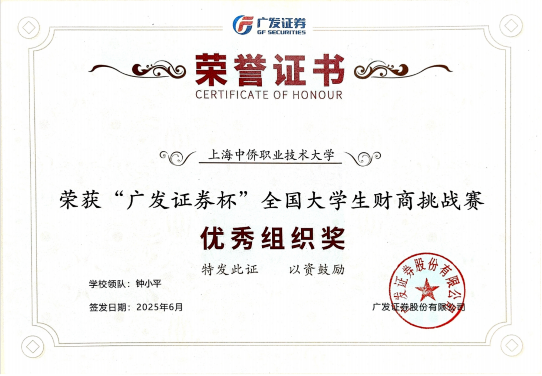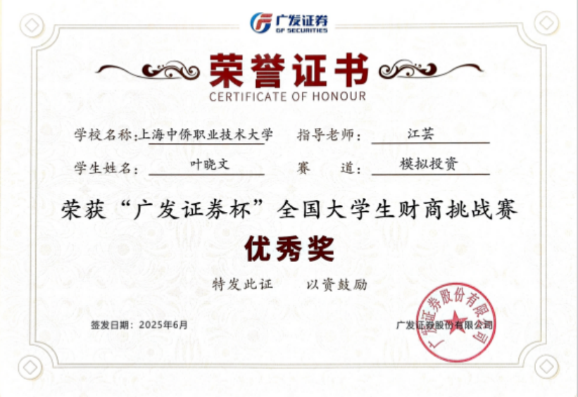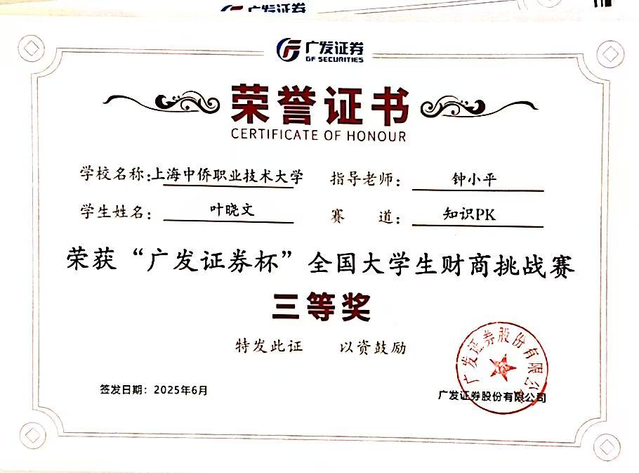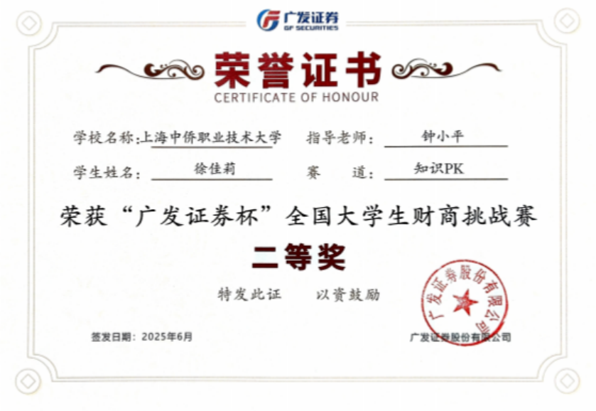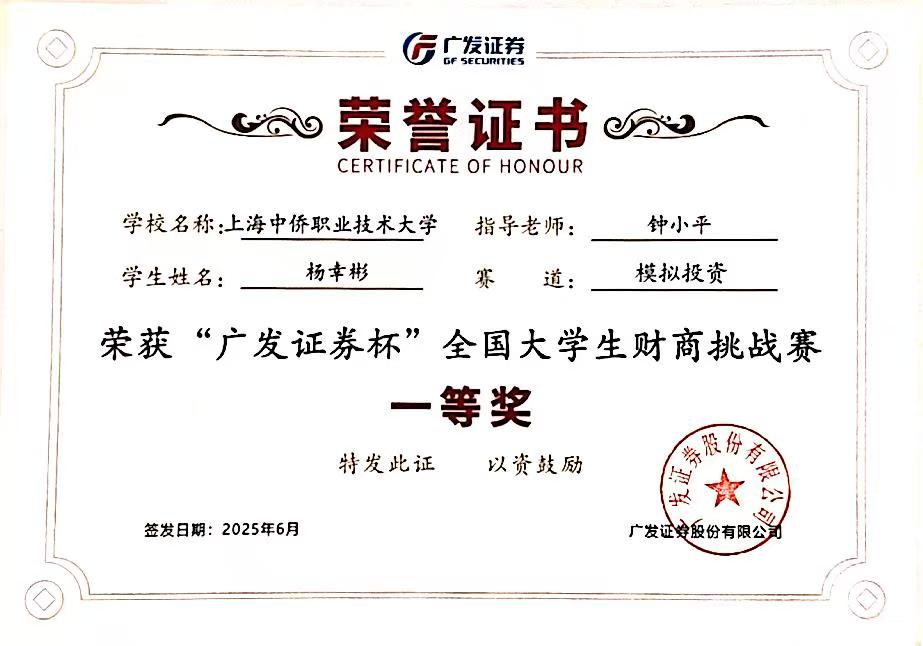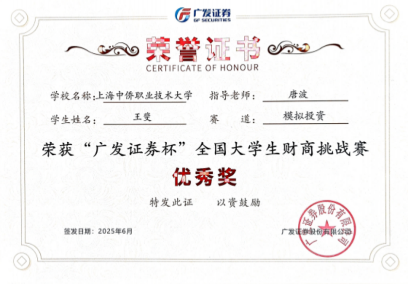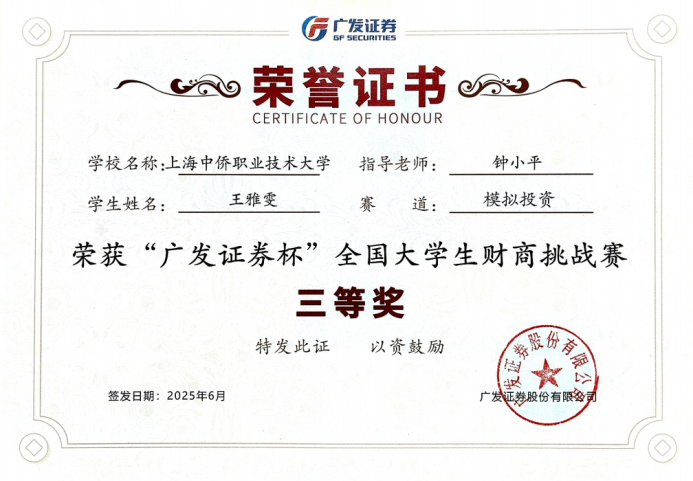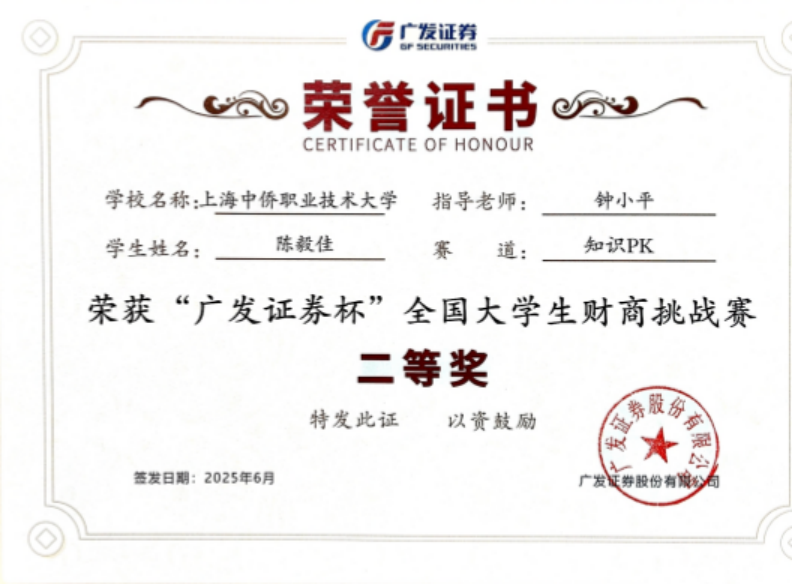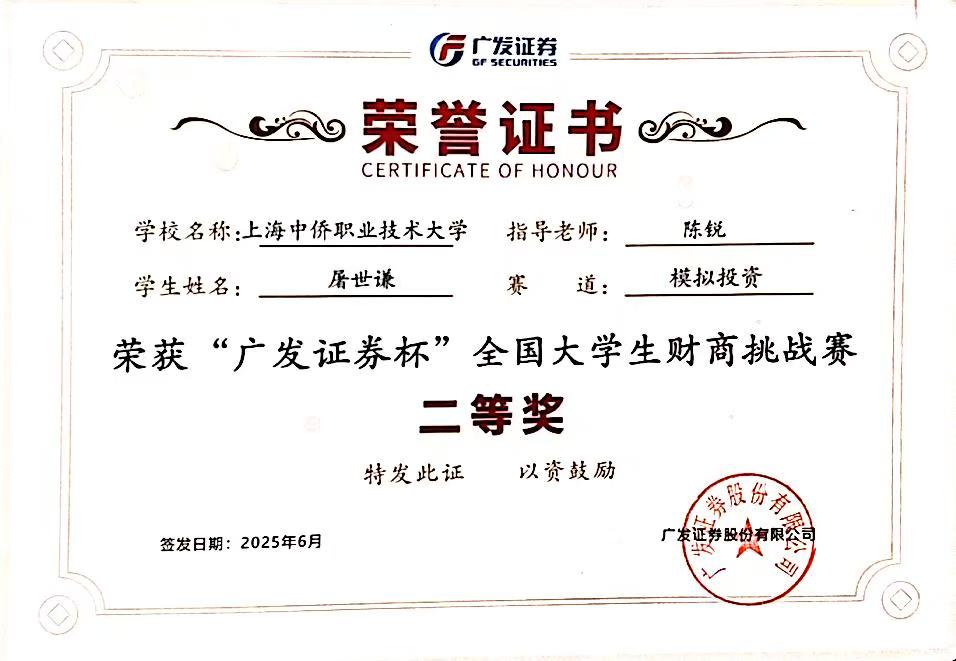 我院指导教师钟小平老师表示:“此次赛事获奖,既是对学子们专业能力的认可,也是对学院实践教学体系的检验。未来,我们将以‘广发证券杯’为起点,加强与金融机构的深度合作,引入更多优质赛事资源,让学生在实战中提升能力;同时,也会总结本次组织经验,更好地服务学生成长,为社会培养更多兼具理论基础与实战能力的复合型金融人才,助力国家投资者教育事业发展。”(供稿:唐波)