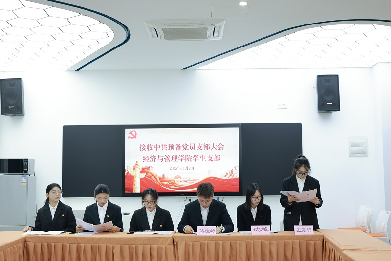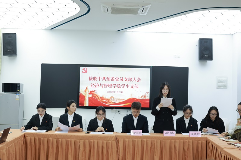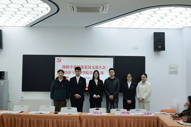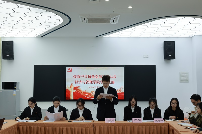2025年11月20日晚上,经济与管理学院学生支部在3号楼402会议室召开预备党员支部接收大会,本次会议严格按照党员发展程序进行,讨论王惠轩、沈越、骆佳岭三位同志为预备党员事宜。会议由经济与管理学院学生支部书记韩伟佳同志主持,我支部共有党员38名,其中有表决权的正式党员23名,出席会议有表决权的党员23名,超过本支部有表决权党员半数,符合规定人数。