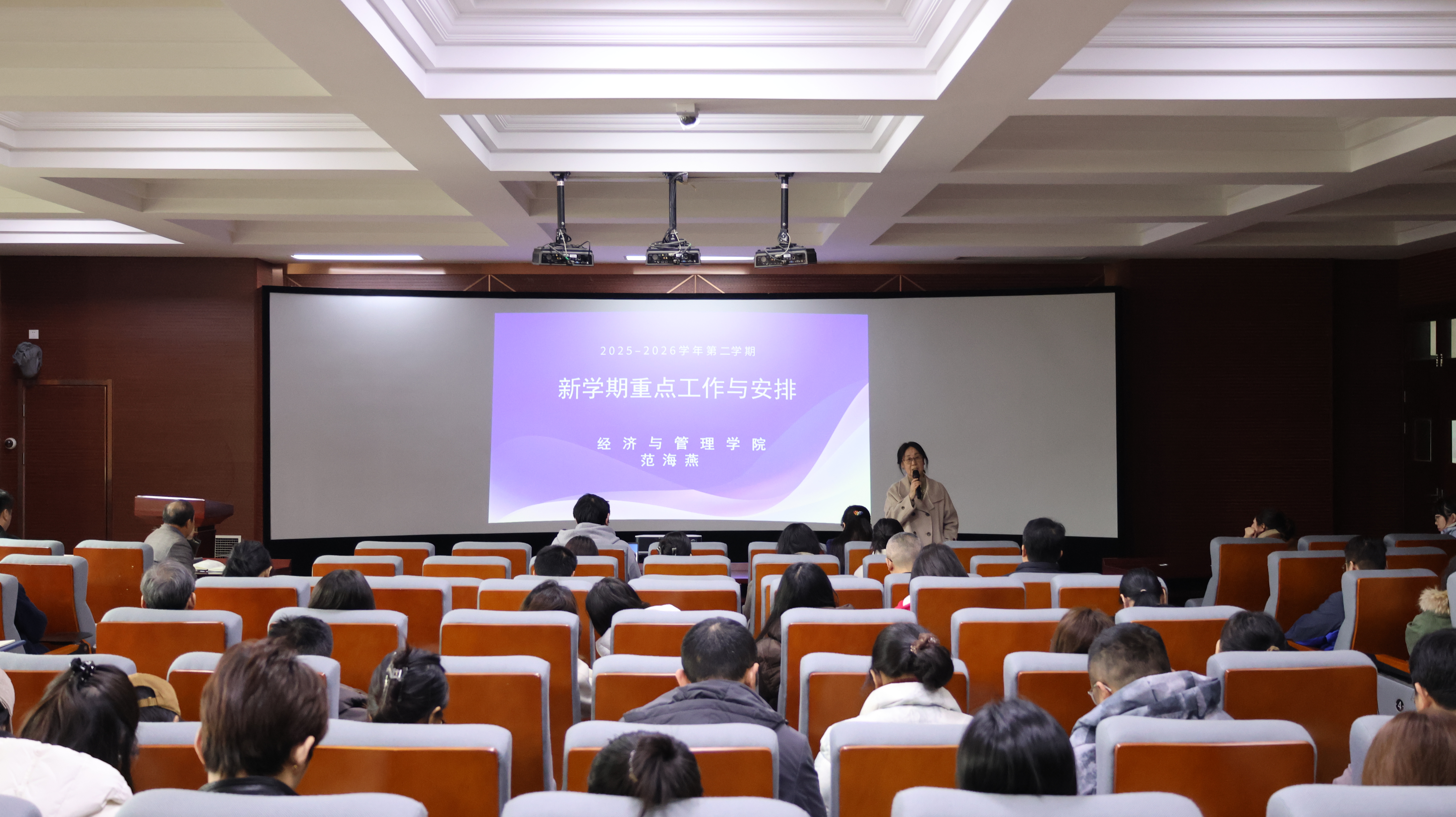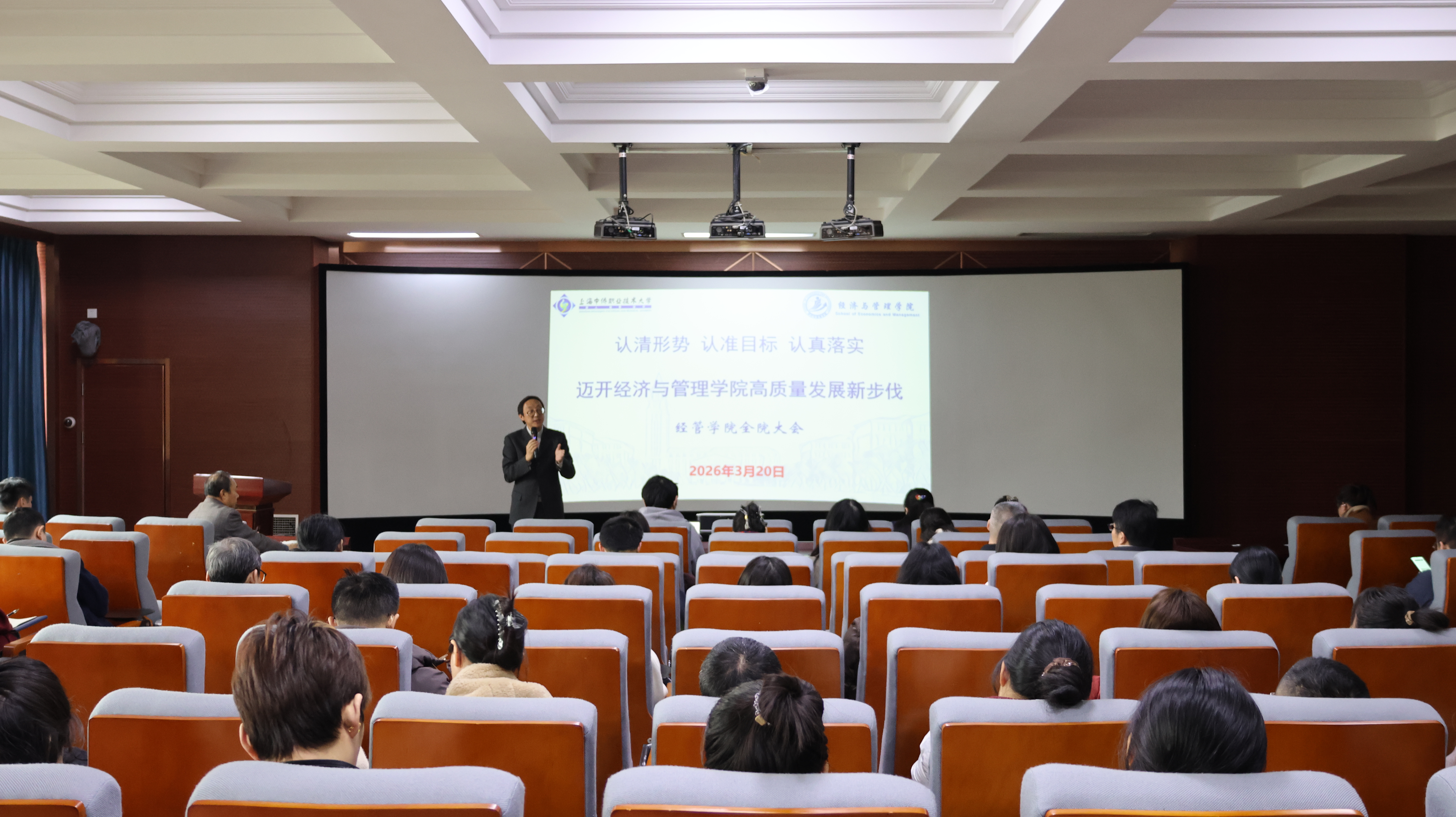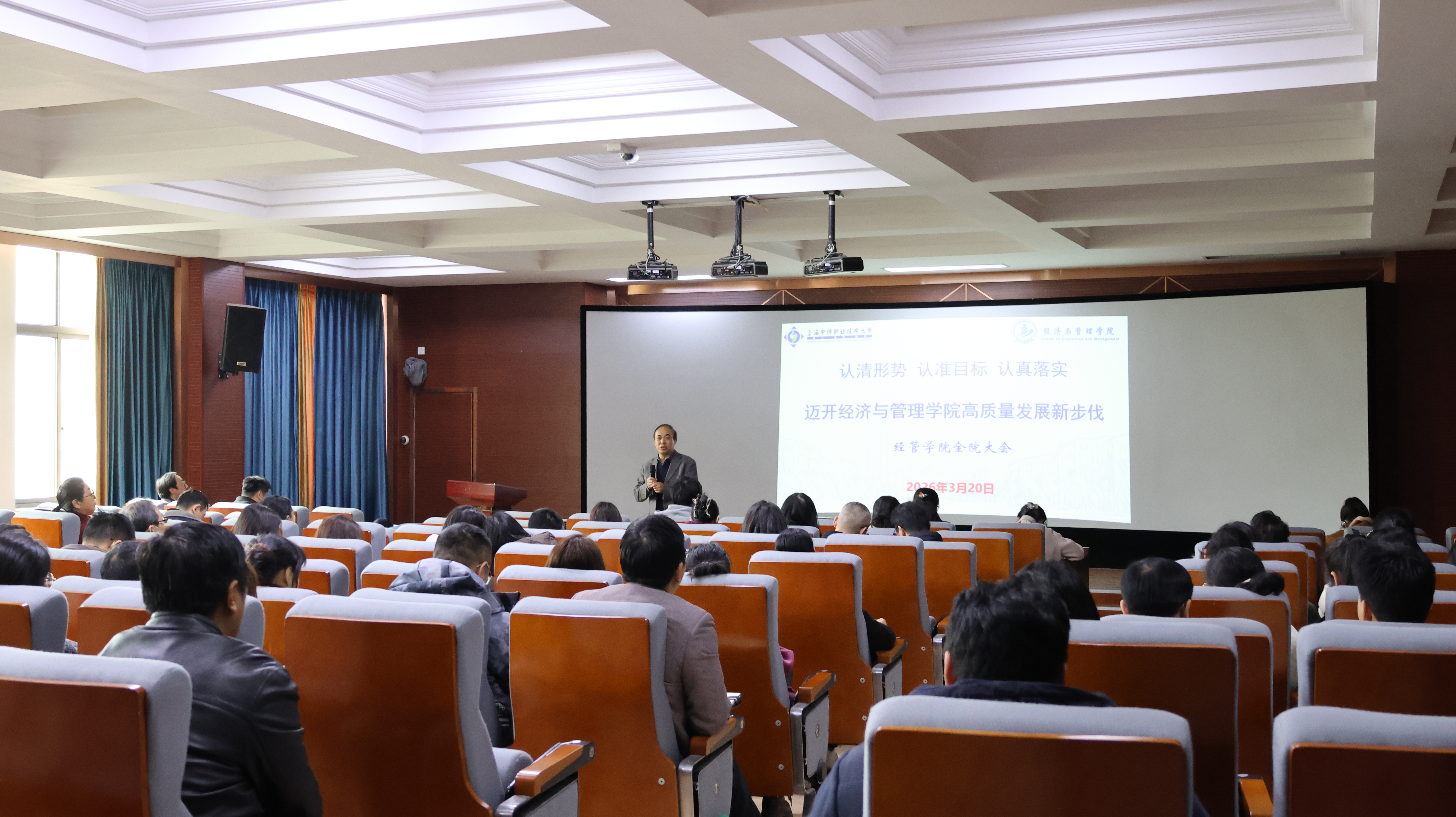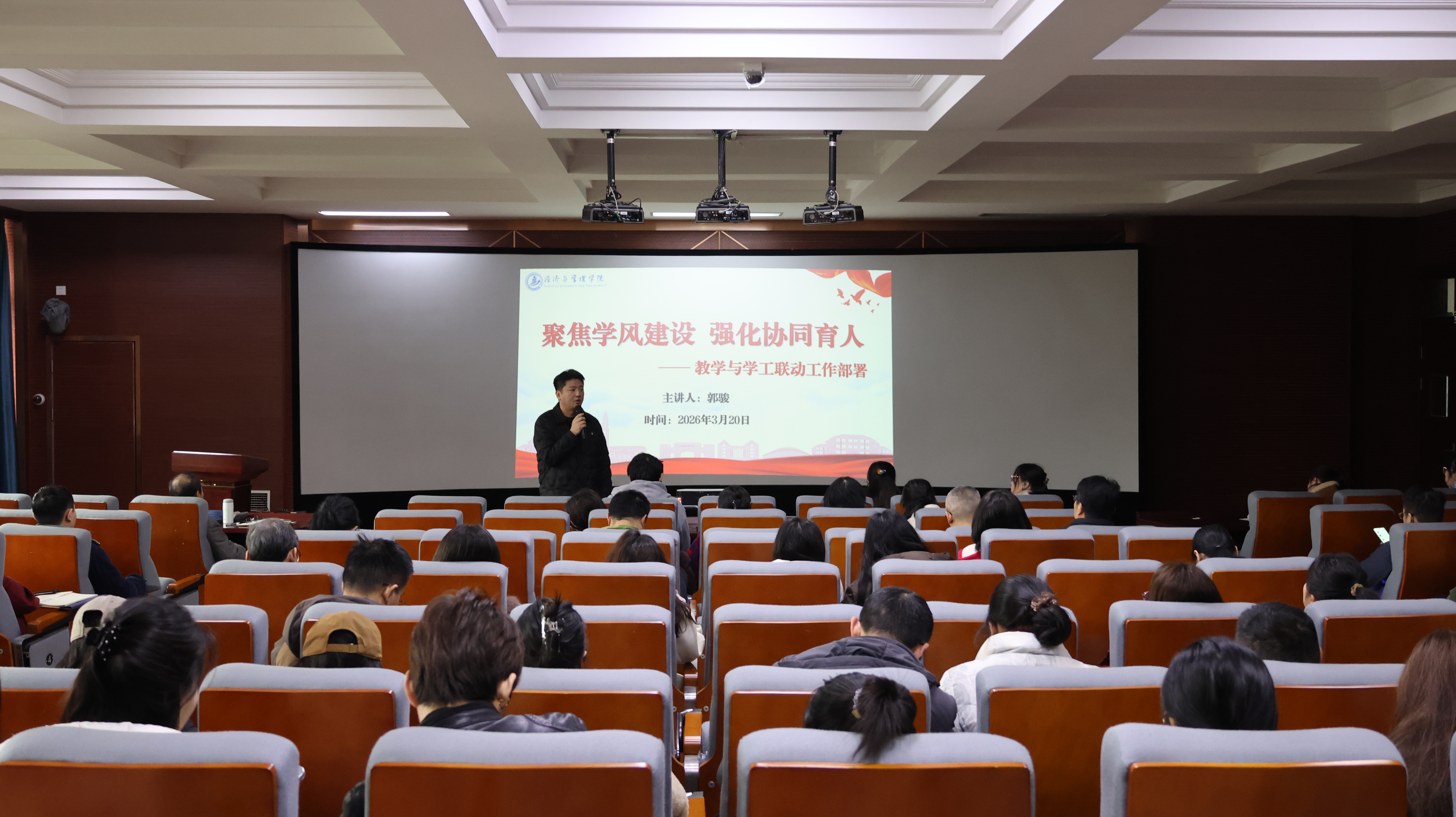3月20日,经济与管理学院召开新学期全院大会。本次大会旨在总结开学三周以来的教学工作,并对新学期后续任务进行再部署、再动员、再落实。学院领导班子及全体教职工参加会议,会议由学院办公室主任韩波主持。